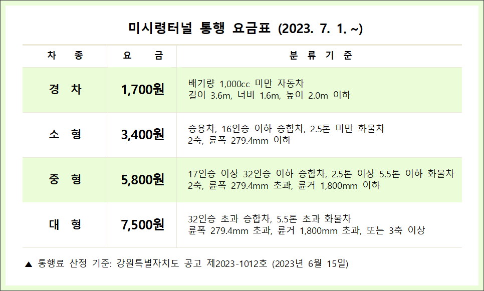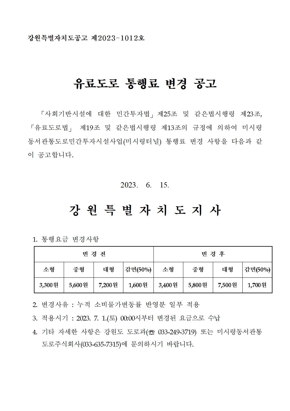 ▼ 미시령터널 통행료 인상 변경 공고문 (적용 시기: 2023년 7월 1일부터)