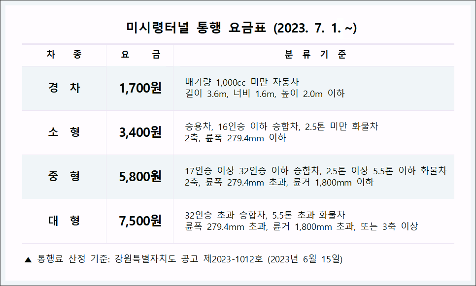 * 미시령터널 통행료 인상 (2023년 7월 1일)