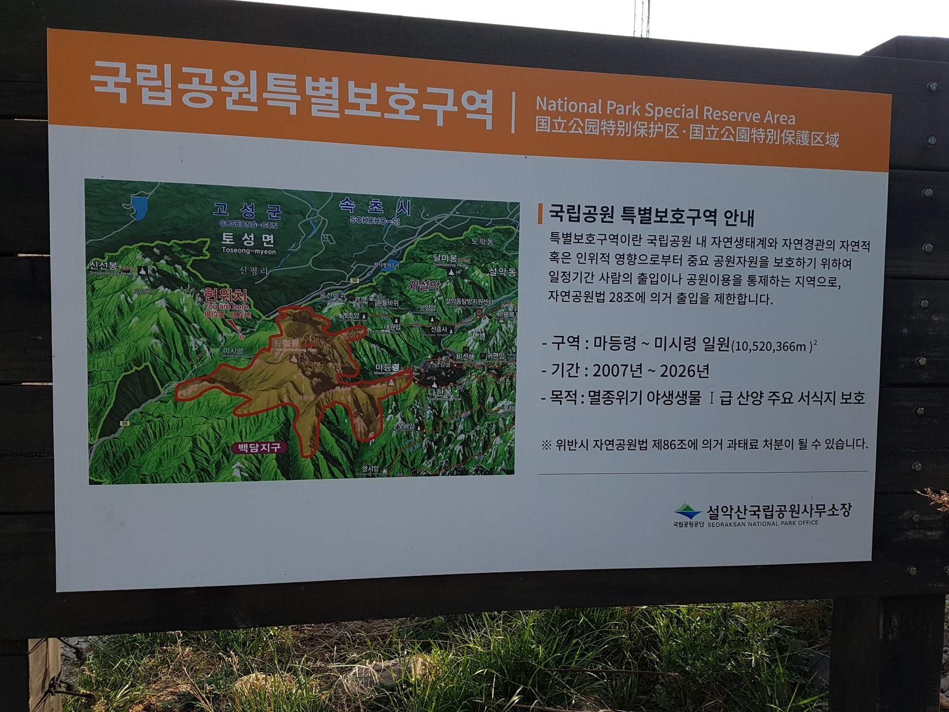 ※ 자연공원법 제28조(출입금지 등)에 의거, 비법정 탐방로의 출입 예방과 단속을 위해 미시령 정상부에 무인계도장비(이동형 영상정보처리기기)를 설치, 운영하고 있음을 알려드립니다.