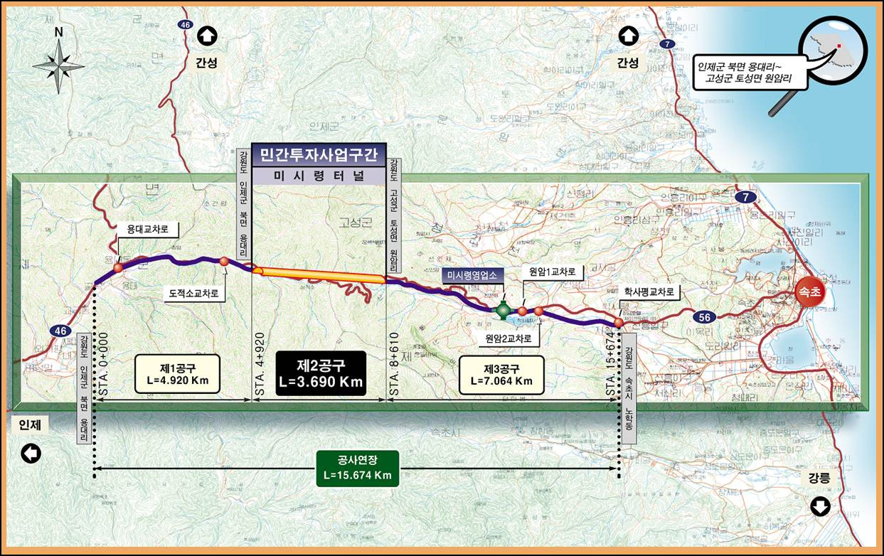 강원도 최초의 SOC 부문 민간투자사업으로 건설된 미시령터널(2006년 5월 3일 개통)은 애초에는 코오롱건설 등 6개 건설 회사가 컨소시엄을 구성해 건설 비용을 분담하고, 터널의 설계와 시공을 맡아 완공하였으나, 2008년 국민연금공단에서 운영권을 인수해 현재까지 관리하고 있습니다. 유료도로인 미시령터널은 개통일로부터 향후 30년간(2006년~2036년) 통행료를 징수하게 됩니다.