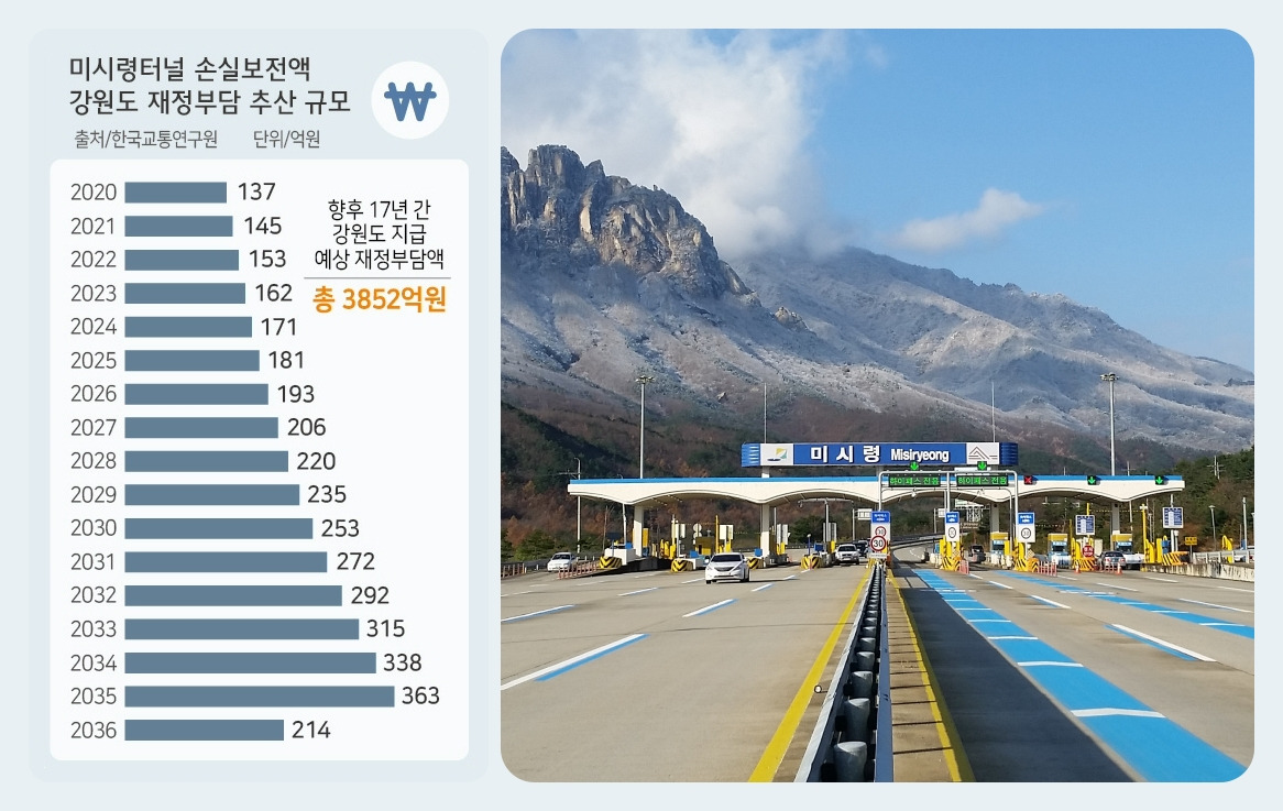 민간투자사업으로 추진돼 2006년 완공된 미시령터널(미시령동서관통도로)은 개통 직후부터 최소운영수입보장(MRG)에 따른 손실보전금 지급으로 '혈세 먹는 하마'로 불리며 열악한 강원도 재정에 큰 부담을 주어 왔습니다.