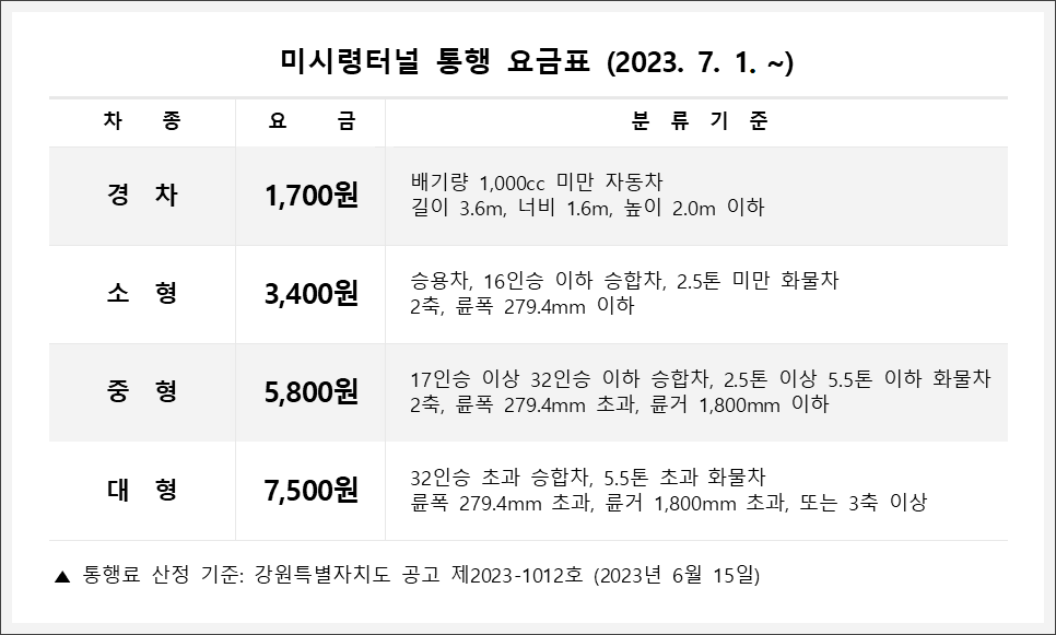 * 미시령터널 통행료 인상 (2023년 7월 1일)
