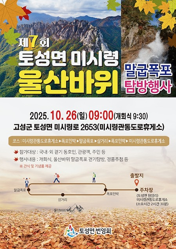 고성군 토성면 번영회가 주최하는 '미시령 울산바위 말굽폭포 탐방행사'가 오는 10월 26일(일) 오전 9시에 열립니다. 이 행사는 원암리 미시령동서관통도로 휴게소를 출발해 설악산의 숨겨진 보석인 말굽폭포를 거쳐 다시 휴게소로 돌아오는 약 5km 구간의 걷기 코스에서 진행됩니다. 설악산의 단풍이 절정을 이루는 시기에 맞춰 진행되기 때문에, 가을의 정취와 함께 울산바위의 웅장한 자태와 말굽폭포의 시원한 물줄기를 감상할 수 있습니다.