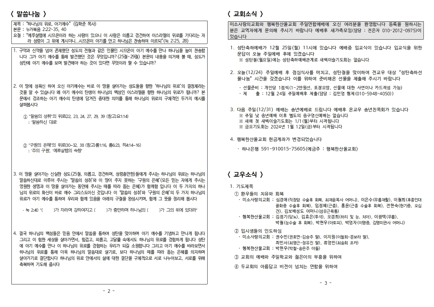| 제목 : “하나님의 위로, 아기예수” (김학준 목사) |