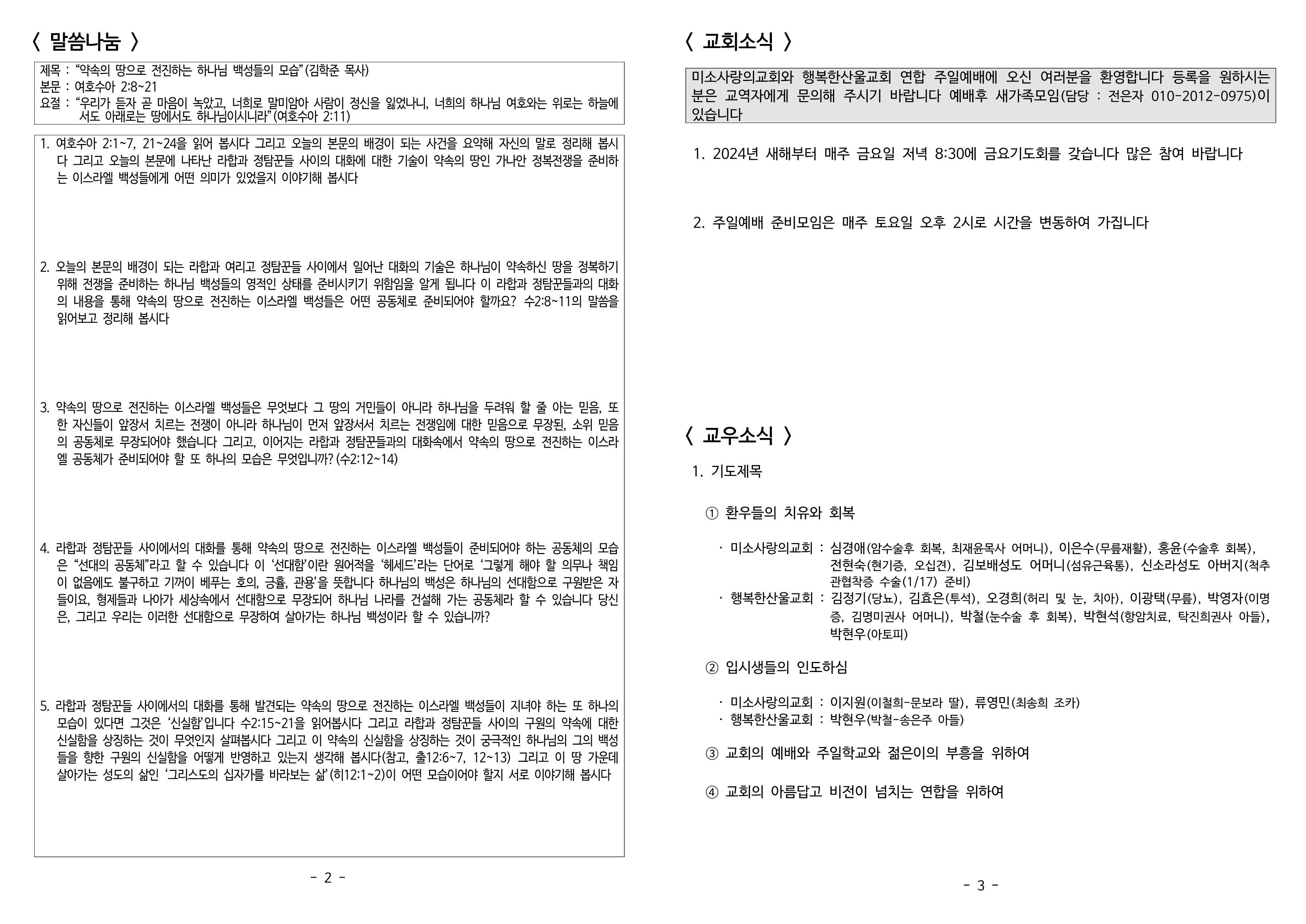 4. 라합과 정탐꾼들 사이에서의 대화를 통해 약속의 땅으로 전진하는 이스라엘 백성들이 준비되어야 하는 공동체의 모습 은 “선대의 공동체”라고 할 수 있습니다 이 ‘선대함’이란 원어적을 ‘헤세드’라는 단어로 ‘그렇게 해야 할 의무나 책임 이 없음에도 불구하고 기꺼이 베푸는 호의, 긍휼, 관용’을 뜻합니다 하나님의 백성은 하나님의 선대함으로 구원받은 자 들이요, 형제들과 나아가 세상속에서 선대함으로 무장되어 하나님 나라를 건설해 가는 공동체라 할 수 있습니다 당신 은, 그리고 우리는 이러한 선대함으로 무장하여 살아가는 하나님 백성이라 할 수 있습니까?