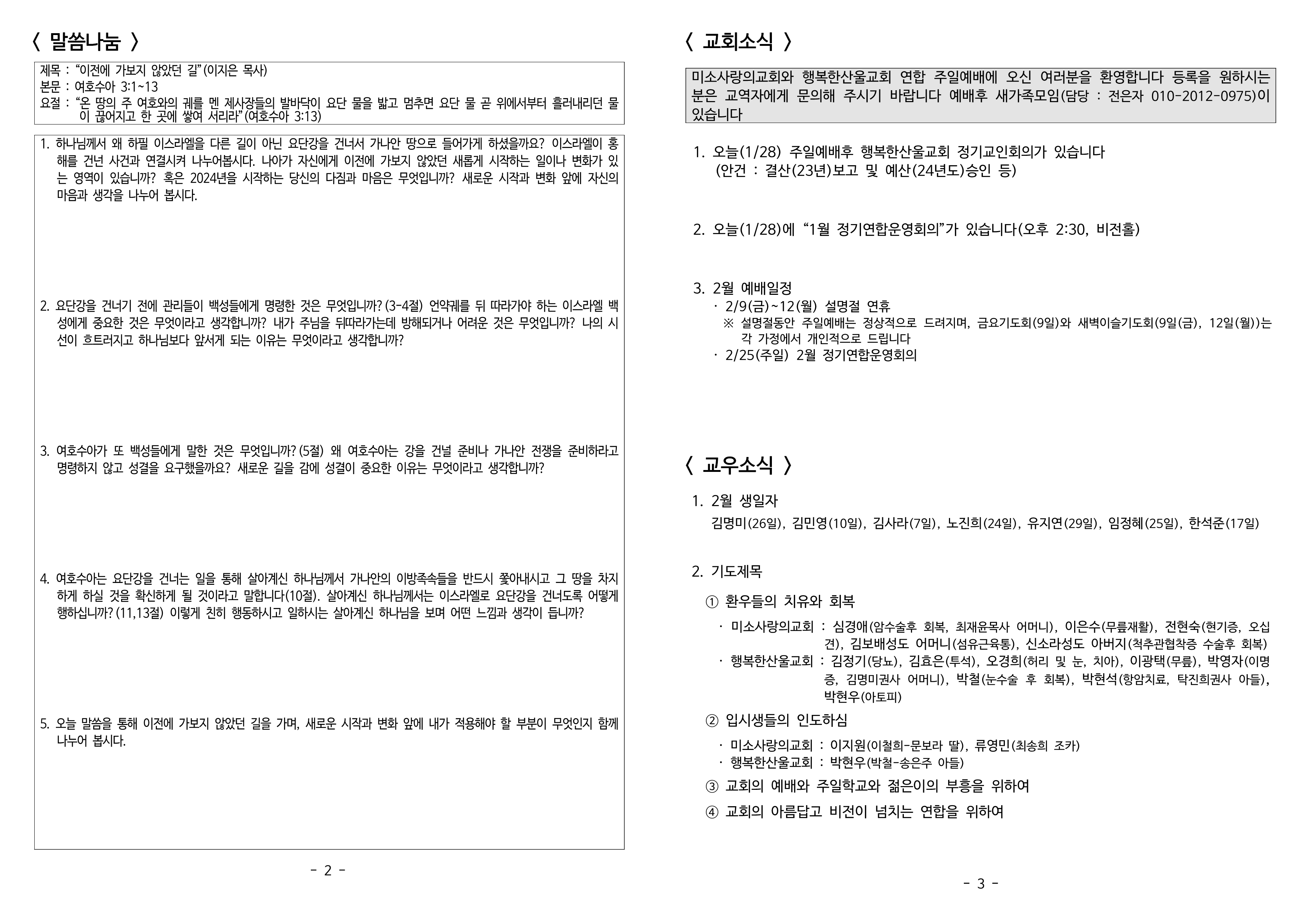 1. 하나님께서 왜 하필 이스라엘을 다른 길이 아닌 요단강을 건너서 가나안 땅으로 들어가게 하셨을까요? 이스라엘이 홍해를 건넌 사건과 연결시켜 나누어봅시다. 나아가 자신에게 이전에 가보지 않았던 새롭게 시작하는 일이나 변화가 있는 영역이 있습니까? 혹은 2024년을 시작하는 당신의 다짐과 마음은 무엇입니까? 새로운 시작과 변화 앞에 자신의 마음과 생각을 나누어 봅시다.