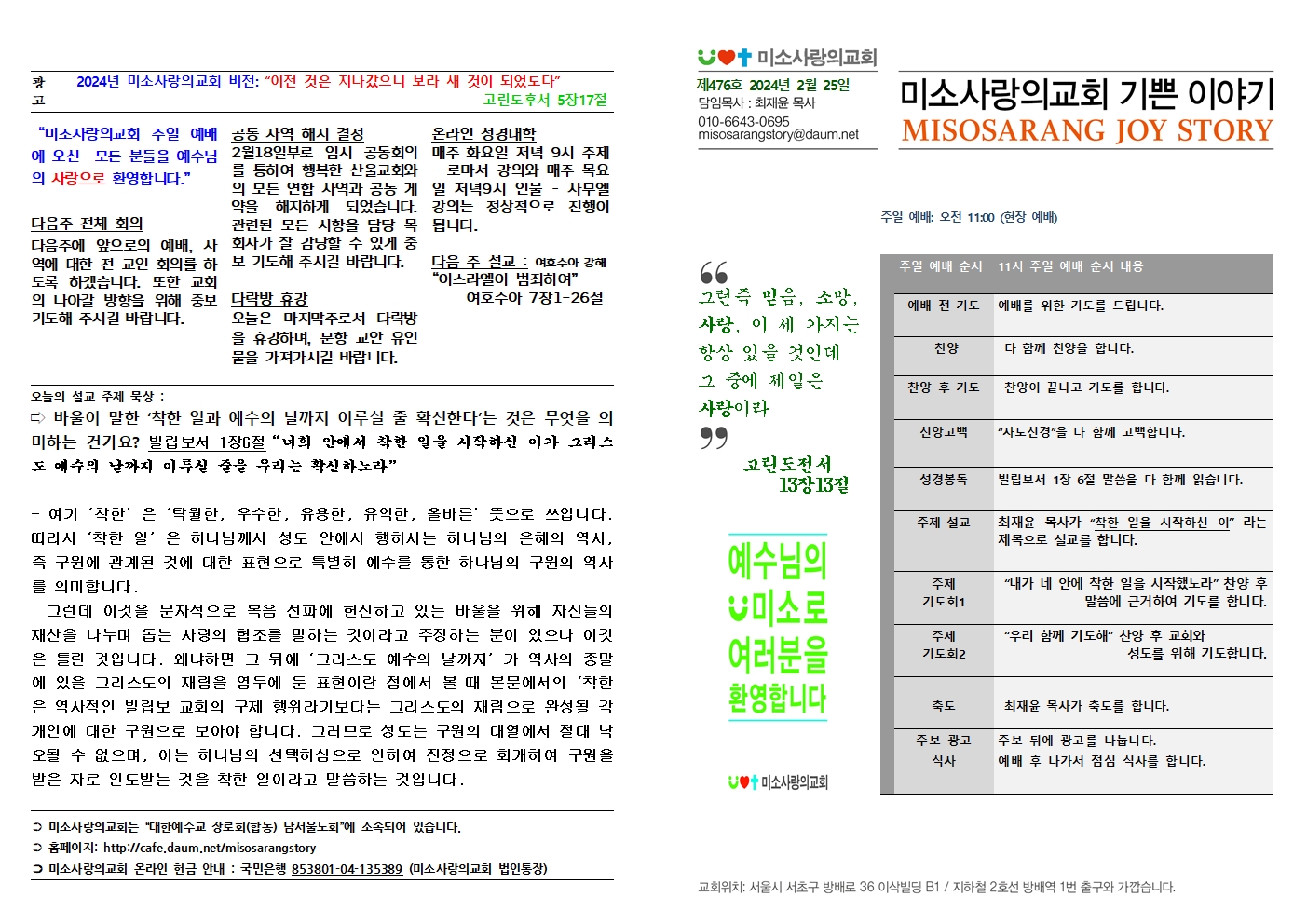 1. 주여, 우리가 고난의 상황에서도 착한 일을 시작하신 주님으로 인하여 하늘의 평강과 기쁨을 실제로 누리며 살아가게 하소서.