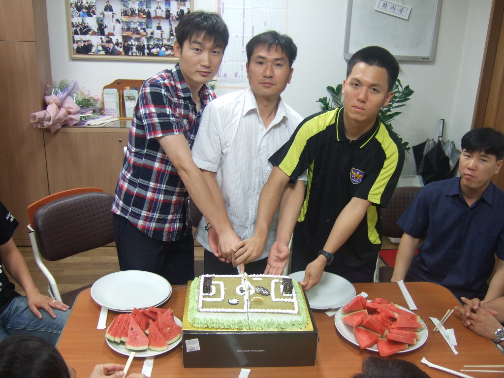 영적으로 새로 태어났으니 케익으로 축하를 하고요. 그리고 월드컵때인 만큼 케익은 축구장 모형의 특별케익