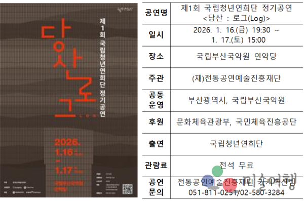 국립청년연희단 정기공연 ‘당산 : 로그(Log)’는 1월 16일과 17일, 국립부산국악원 연악당에서 펼쳐진다. ‘당산 : 로그(Log)’는 공동체의 탄생과 붕괴, 그리고 다시 이어지는 희망의 과정을 가무악희의 총체적 예술형태로 그려낸 창작연희다. 전통연희의 농악, 무속, 줄타기 등 다양한 종목과 미디어아트가 결합해 욕망과 갈등의 시대를 지나 각자도생의 현실에 놓인 현대사회를 비춘다. 또한 오랜 전통을 현대의 언어로 새롭게 계승하고 청년을 위로하며 미래를 향한 공동체의 희망을 노래한다.
