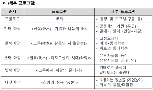 | 1. 9.(금)~10.(토): 평택아트센터에서 단원과 공동 창작한 국립청년무용단 ‘일원(一圓)’ 공연 1. 16.(금)~17.(토): 국립부산국악원에서 전통연희 분야 최초 국립단체 국립청년연희단의 ‘당산, 로그(Log)’ 공연 평택시문화재단, 국립부산국악원 등 지역 인프라 활용으로 지역 문화예술 향유에 기여 |