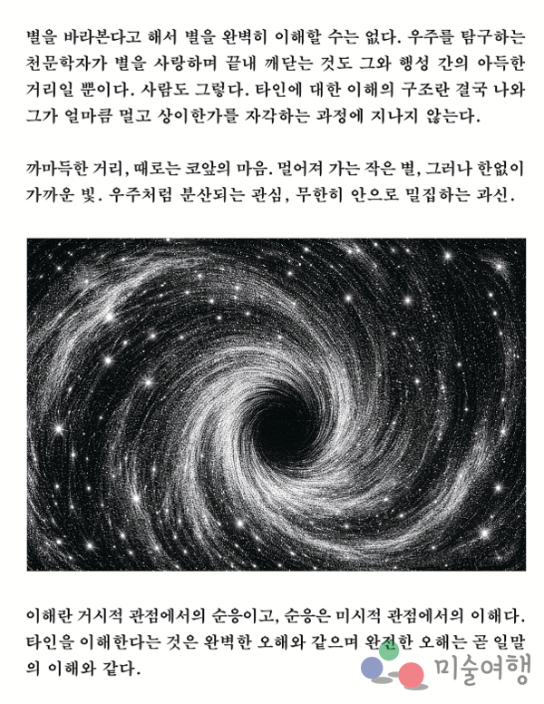 전시기간 동안 일부 공간에서는 작가의 서신 형식의 원고도 공개된다. ‘운명이란 신이 창조해 낸 거대한 흐름이 아닌, 고작 한 인간이 만든 일말의 감정일 수도 있다’는 문장처럼, 작품은 사랑을 거창한 서사 대신 스쳐 지나갈 수도 있었던 하루의 감정으로 조명한다.