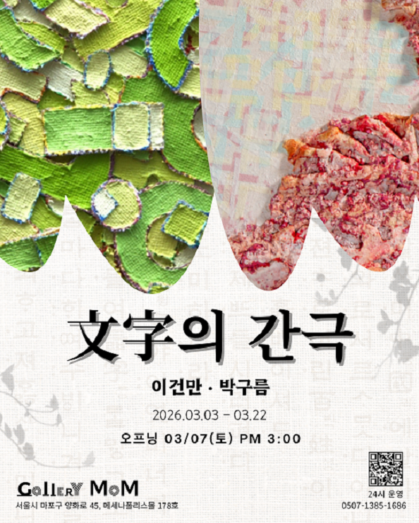 [미술여행=엄보완 기자] 갤러리몸 (서울시 마포구 양화로 45, 메세나폴리스몰 178호)이 2026년 봄을 맞아 현대미술작가 이건만과 종이의 물성을 탐구하는 작가 박구름의 2인전: "文字의 간극"(문자의 간극) 을 선보인다.