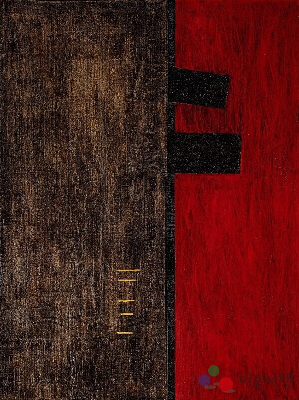 그런데 <무위의풍경2>에서는 수평적으로 펼쳐졌던 네모의 격자가 검은 색, 빨간 색, 황금 색으로 수렴 혹은 확산되는 중첩의 양상으로 형상화되기도 하고, 형태와 색채를 달리 하여 일(一)과 합쳐져서 수직적으로 일(一)자에 가까운 형태로 나타나기도 하며, 궁극적 보편자의 동그라미와 현상적 개별자의 네모가 한 데 합쳐져서 비정형적 형상으로 가로나 세로의 방식 혹은 수평과 수직의 방식이 교차 대조되는 방식으로 표현되기도 한다.