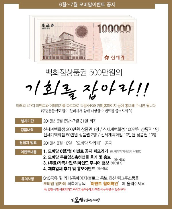 모비맘 6월~7월 특별이벤트 신세계백화점 상품권500만원의 기회를 잡아라!