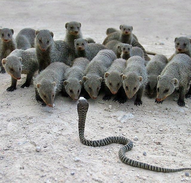 몽구스 ; 같은 몽구스科 동물이기 때문에 생김새나 생태는 비슷하지만, 연약한 미어캣과 달리 잔인한 육식성 포식자다. 지금까지 발견된 10종의 몽구스가 아프리카‧남유럽‧서아시아 등지에 폭 넓게 분포한다. 작고 짧은 다리가 특색이며 코끝이 뾰족하고 털이 많은 긴 꼬리를 가지고 있다. 대부분의 종은 몸길이가 45㎝가량이며 그 중 꼬리가 15~20㎝다. 가장 덩치가 큰 유플레스 마요르種은 꼬리를 뺀 몸길이가 80~90㎝에 달한다. 미어캣처럼 굴속에서 지내지만 헐썩 더 활동적이며, 열매‧새‧파충류‧작은 포유동물 등 닥치는 대로 잡아먹는다. 새나 파충류의 알도 즐겨 먹는다. 동작이 워낙 날쌔기 때문에 물리지 않고 독사를 잡아서 맛있게 먹기도 한다. 무슨 동물이든 닥치는 대로 잡아먹기 때문에 미국에서는 모든 종류의 몽구스 유입을 엄격하게 금지하고 있다. 늪몽구스는 비버처럼 半 수중생활을 한다.