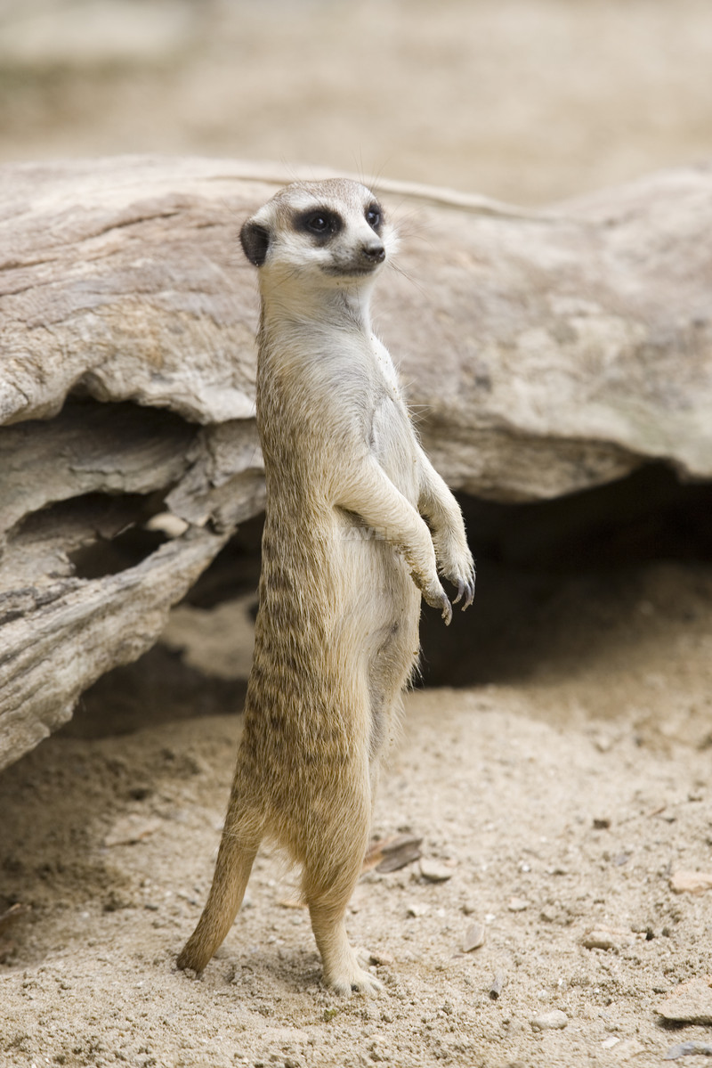 미어캣 ; 몽구스科에 속하는 포유동물로 30마리 안팎이 무리지어 산다. 무리 안에서는 암수 각각 서열이 엄격하게 정해져 있다. 땅굴을 파서 그 속에서 살아가는데, 낮 동안에는 밖으로 나와 햇볕을 쬐거나 곤충을 잡아먹다가 밤이 되면 굴속으로 들어가 잔다. 무리가 활동할 때는 돌아가며 몸을 꼿꼿이 세운 채 천적을 감시하기 때문에 파수꾼이라는 별명을 가지고 있다. 파수꾼은 잘 보이는 곳에서 감시를 하다가 가장 늦게 피신하기 때문에 맹금이나 맹수에게 잡혀 먹히기 쉽다. 미어캣은 대부분 남부 아프리카의 건조지대에 서식한다. 몸길이는 50㎝가량이며, 그 중 꼬리가 20㎝쯤 된다. 귀는 초승달 모양으로 끝이 뾰족하며, 굴을 파기에 알맞도록 길고 날카로운 발톱을 가지고 있다. 해마다 11~12월에는 2~5마리의 새끼를 낳는데, 무리 안에서 근친상간을 하기 때문에 열성유전으로 멸종되어가고 있다. 미어캣이 서식하는 각국 정부에서는 이종교배에 힘을 기울여 종 보존에 노력하고 있다.