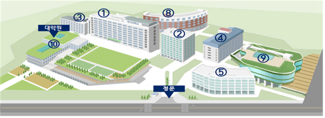 ① 종합관 ②학생회관 ③미래관 ④국제관 ⑤행정동 ⑧생활관 ⑨방목학술정보관 ⑩ MCC(3층 10350호 대학원)