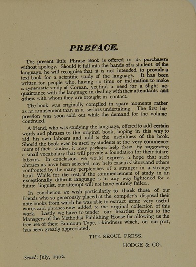 이 인쇄의 기술 부문 책임자는 영국에서 파견된 하지(Hodge,J.W.)였는데, 그는 1897년에 『한국어자전 Corean Words and Phrases;A Handbook and Pocket Dictionary for Visitors to Corea and New Arrivals in the Country』(표지는 The Stranger’s Handbook of The Corean Language)이라는 한국어 회화책을 편찬하였다.