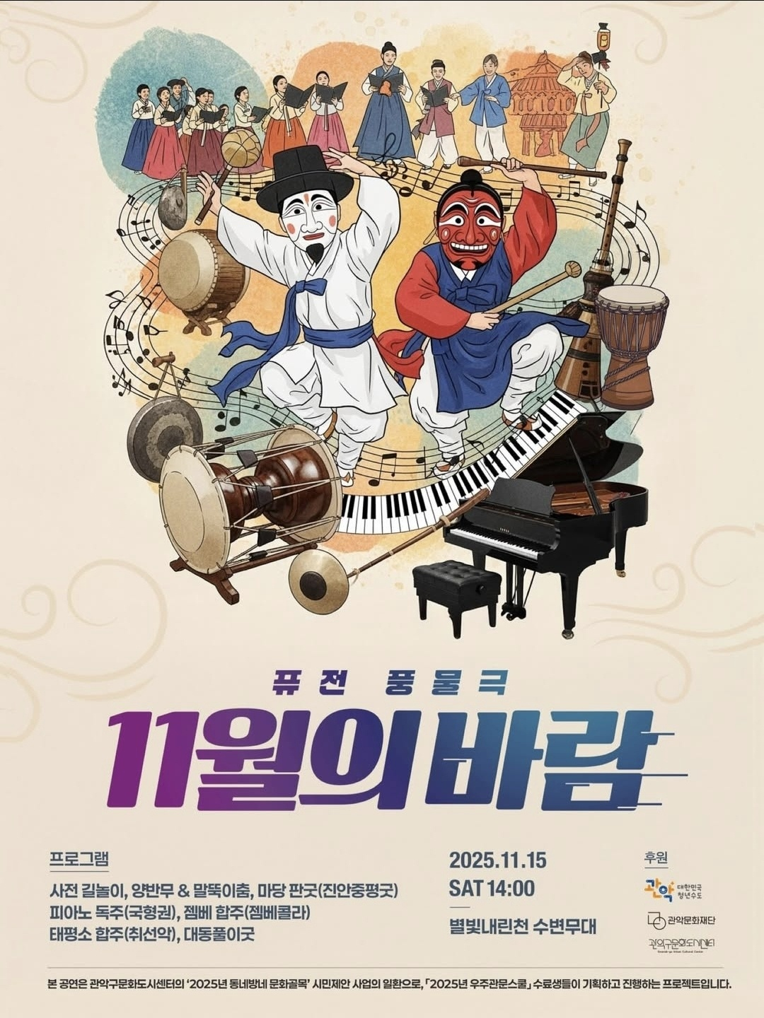 관악문화재단 「2025년 우주관문스쿨」 수료생 지원 프로젝트 『퓨전 풍물극 〈11월의 바람〉』 작성자노유한 조교|작성시간25.11.14|조회수36 목록 댓글 0 글자크기 작게가 글자크기 크게가 다음검색 현재 게시글 추가 기능 열기 북마크 공유하기 신고 센터로 신고 댓글 댓글 0 댓글쓰기 답글쓰기 댓글 리스트