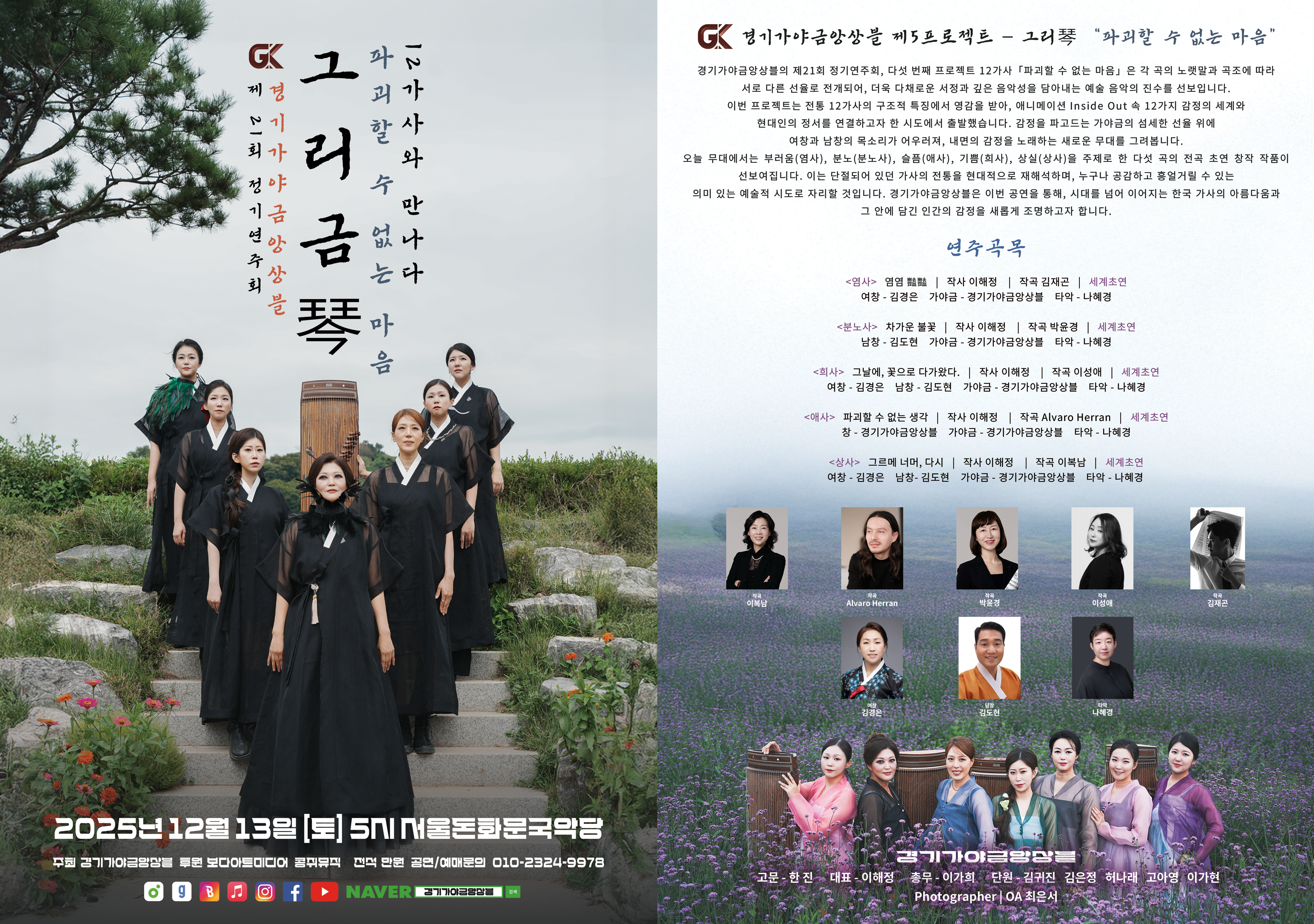 경기가야금앙상블 <제21회 정기연주회> 작성자조민우 조교|작성시간25.11.26|조회수34 목록 댓글 0 글자크기 작게가 글자크기 크게가 다음검색 현재 게시글 추가 기능 열기 북마크 공유하기 신고 센터로 신고 댓글 댓글 0 댓글쓰기 답글쓰기 댓글 리스트
