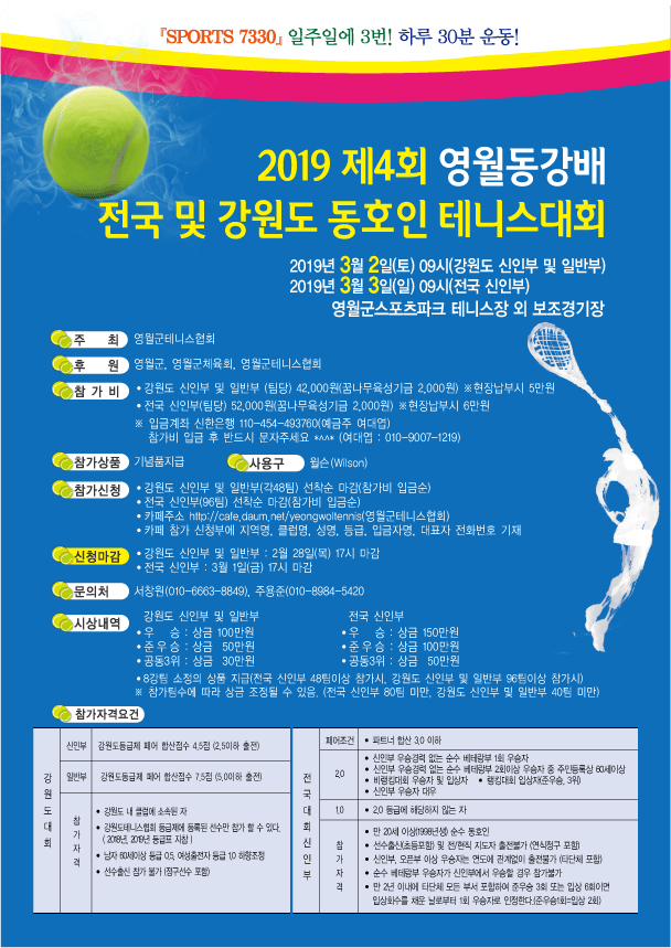 2019 제4회 영월동강배 전국 및 강원도 동호인 테니스대회 대회요강 작성자탐탐탐|작성시간19.01.31|조회수88 목록 댓글 0 글자크기 작게가 글자크기 크게가 제4회 영월동강배 테니스대회 대회요강(최종본).hwp 첨부파일첨부된 파일이 2개 있습니다. gif 파일 영월동강배-A4전단지(최종본).gif 다운로드 hwp 파일 제4회 영월동강배 테니스대회 대회요강(최종본).hwp 다운로드 다음검색 현재 게시글 추가 기능 열기 북마크 공유하기 신고 센터로 신고 댓글 댓글 0 댓글쓰기 답글쓰기 댓글 리스트