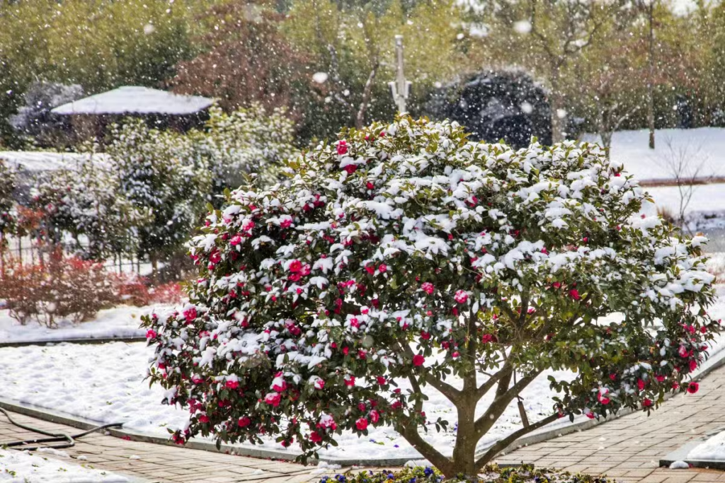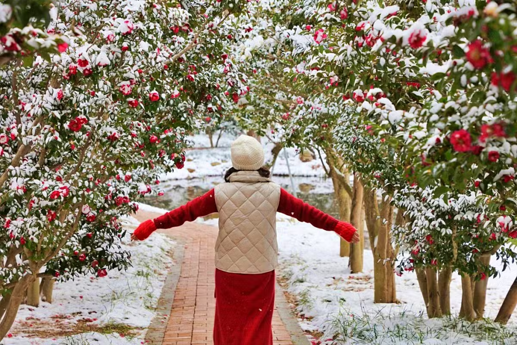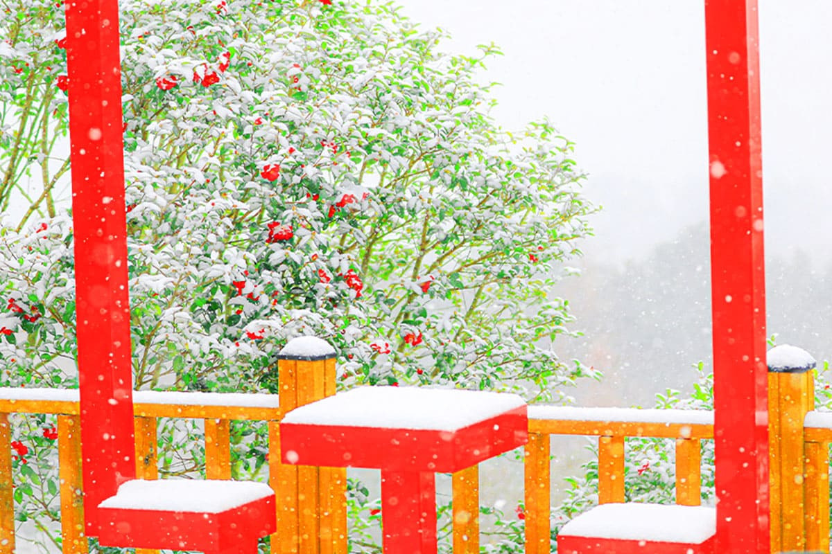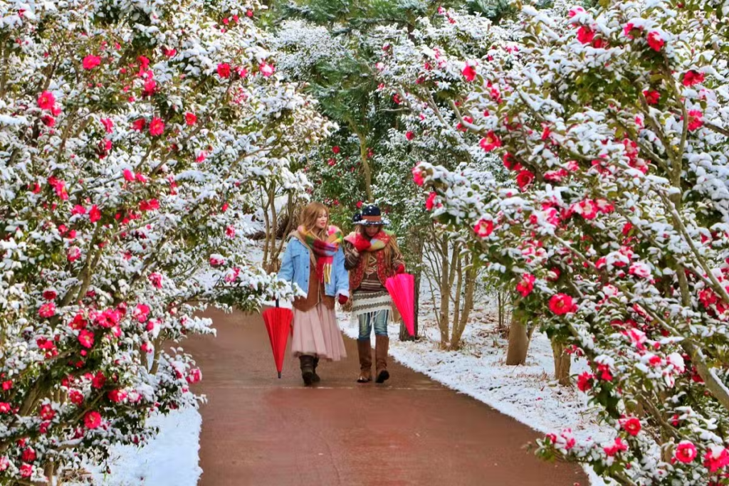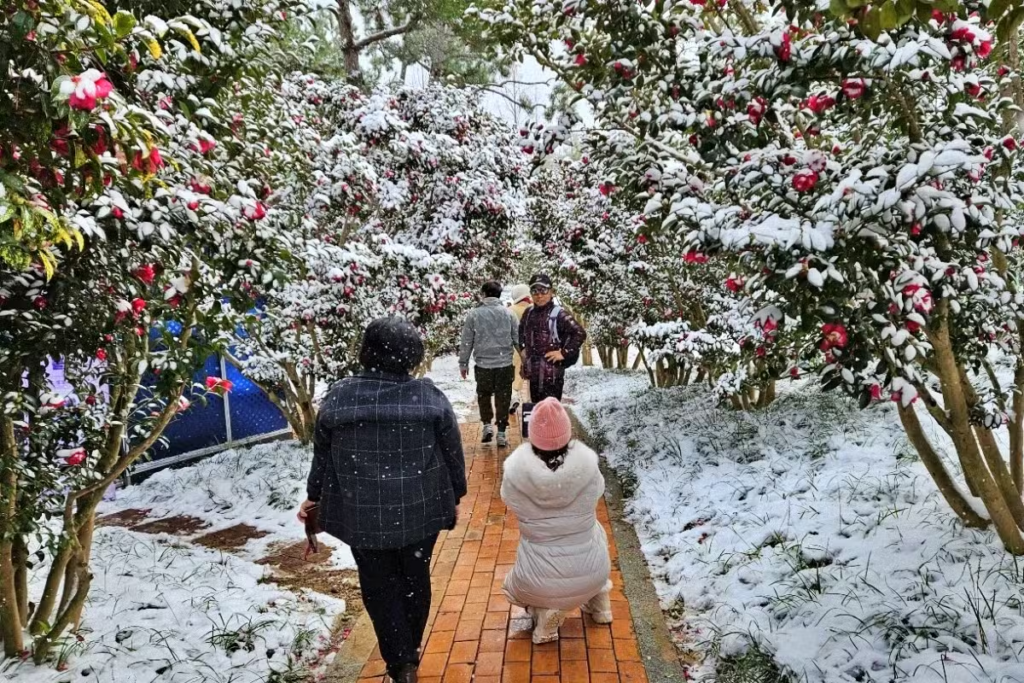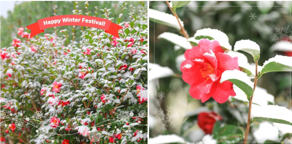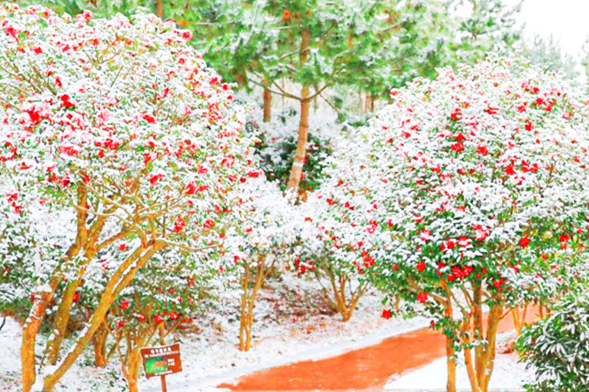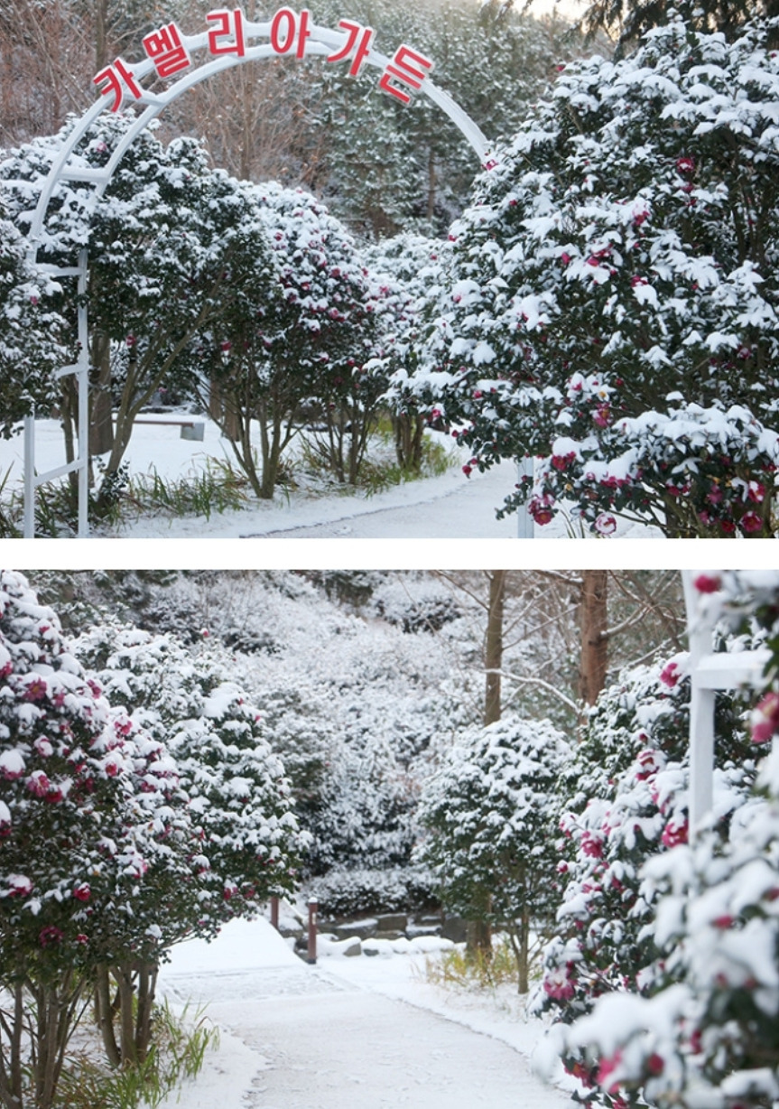 동백꽃과 눈이 어우러진 이 특별한 겨울의 향연은 오직 1004섬 분재정원에서만 만날 수 있는 장관이죠.
