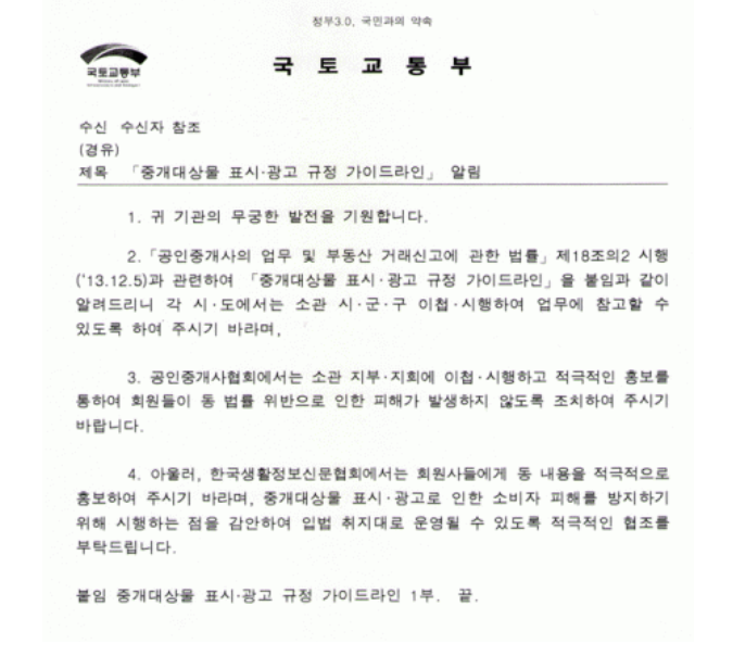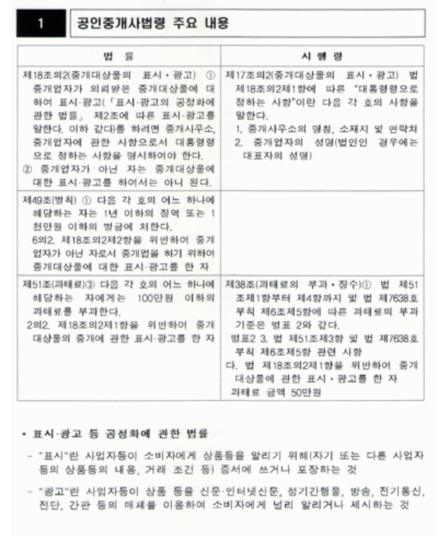 국토교통부)「중개대상물 표시·광고 규정 가이드 라인」알림 작성자명지대부동산대학원 교육사무국|작성시간13.12.27|조회수257 목록 댓글 2 글자크기 작게가 글자크기 크게가 다음검색 현재 게시글 추가 기능 열기 북마크 공유하기 신고 센터로 신고 댓글 댓글 2 댓글쓰기 답글쓰기 댓글 리스트 작성자김종언 | 작성시간 13.12.27 좋은 자료...꼭 숙지를....우리공인중개사의 위상도 좋아져야 하니까..... 작성자김영철 | 작성시간 13.12.27 좋은정보 감사합니다. 댓글 전체보기