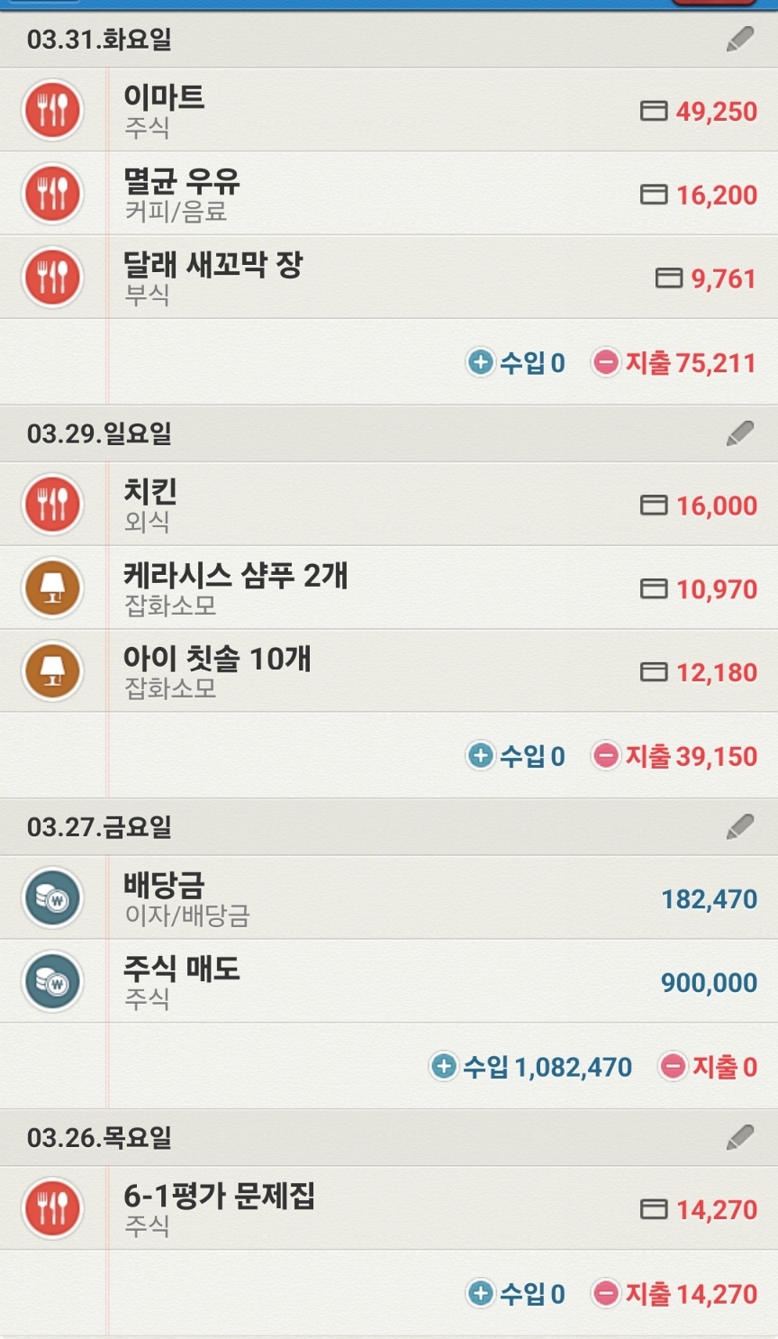 정신없는 3월 마지막주 보낸것 같아요. 아이 단원평가도 체크해주고, 학원, 학교 숙제며 준비물 등을 3월 말에는 스스로 잘 챙기기 바라며 잔소리 좀 하구요~ 다행히 어느정도 알아서 잘 챙겨가더라구요. 좀 고맙기도 하고 키워놓으니 덜 힘들구나 싶기는 한 마음입니다.