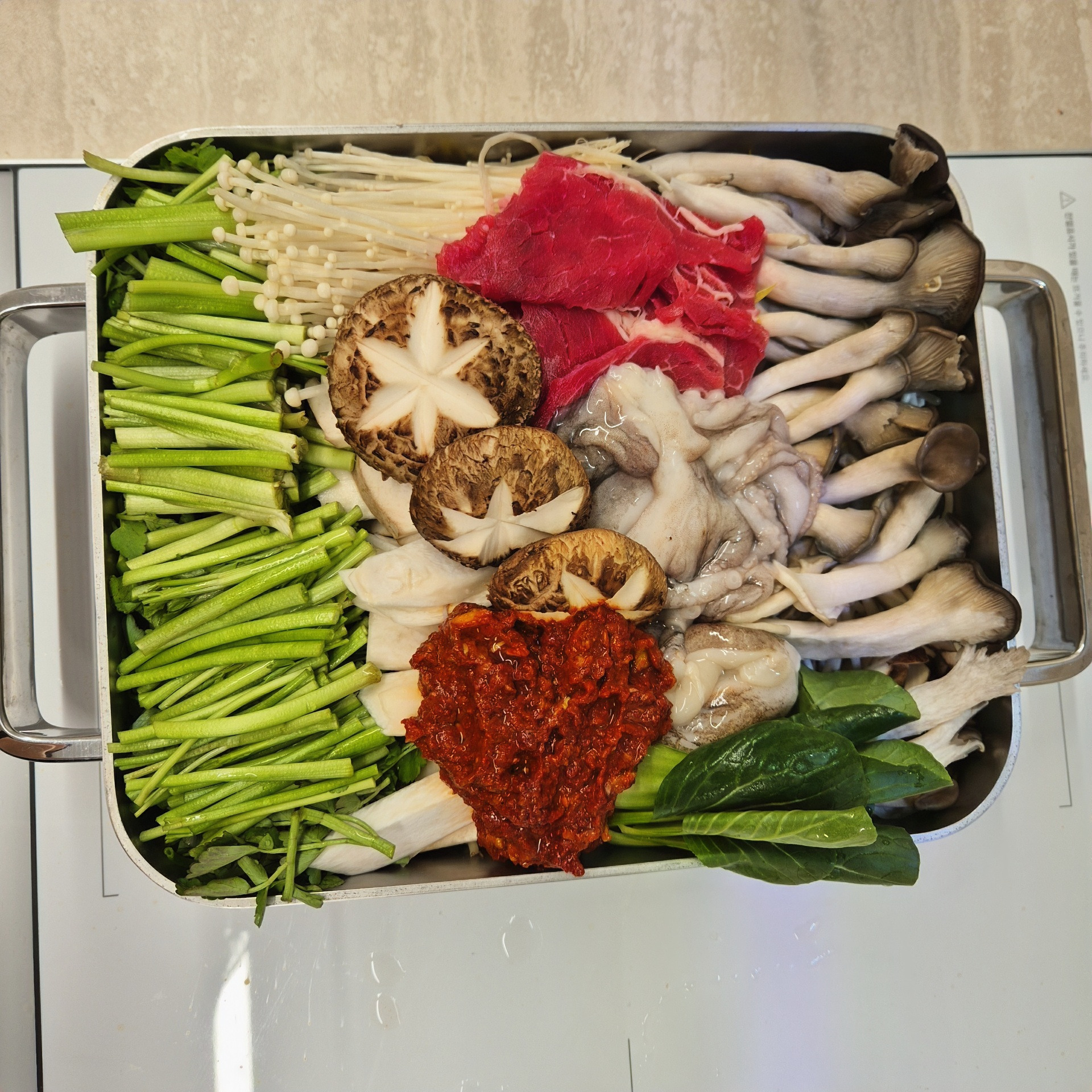 냄비바닥에 숙주깔고 위에 각종버섯, 채소 올리고