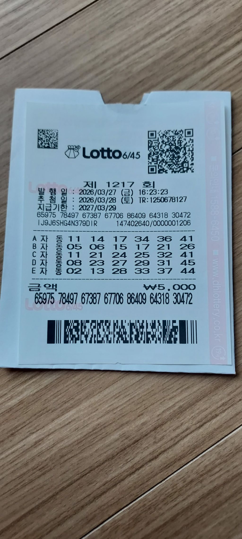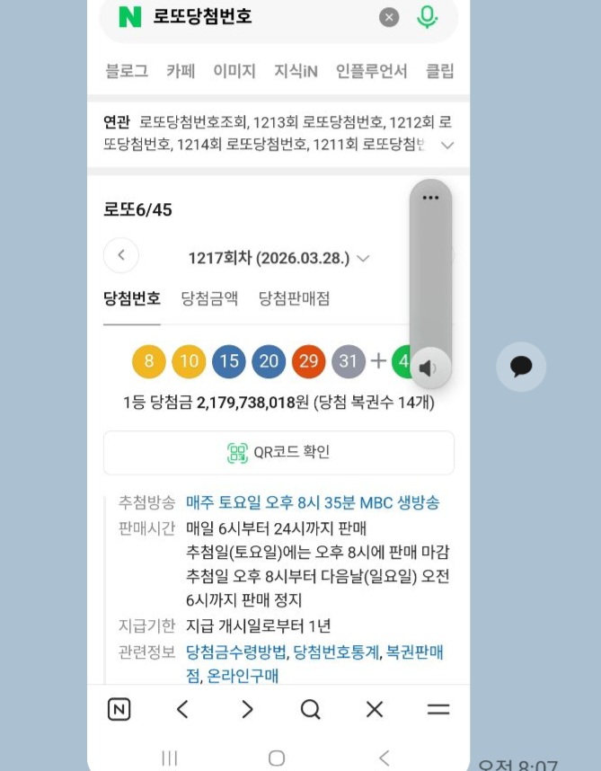 제가 맞춰서 복권 한장 당첨되었어요