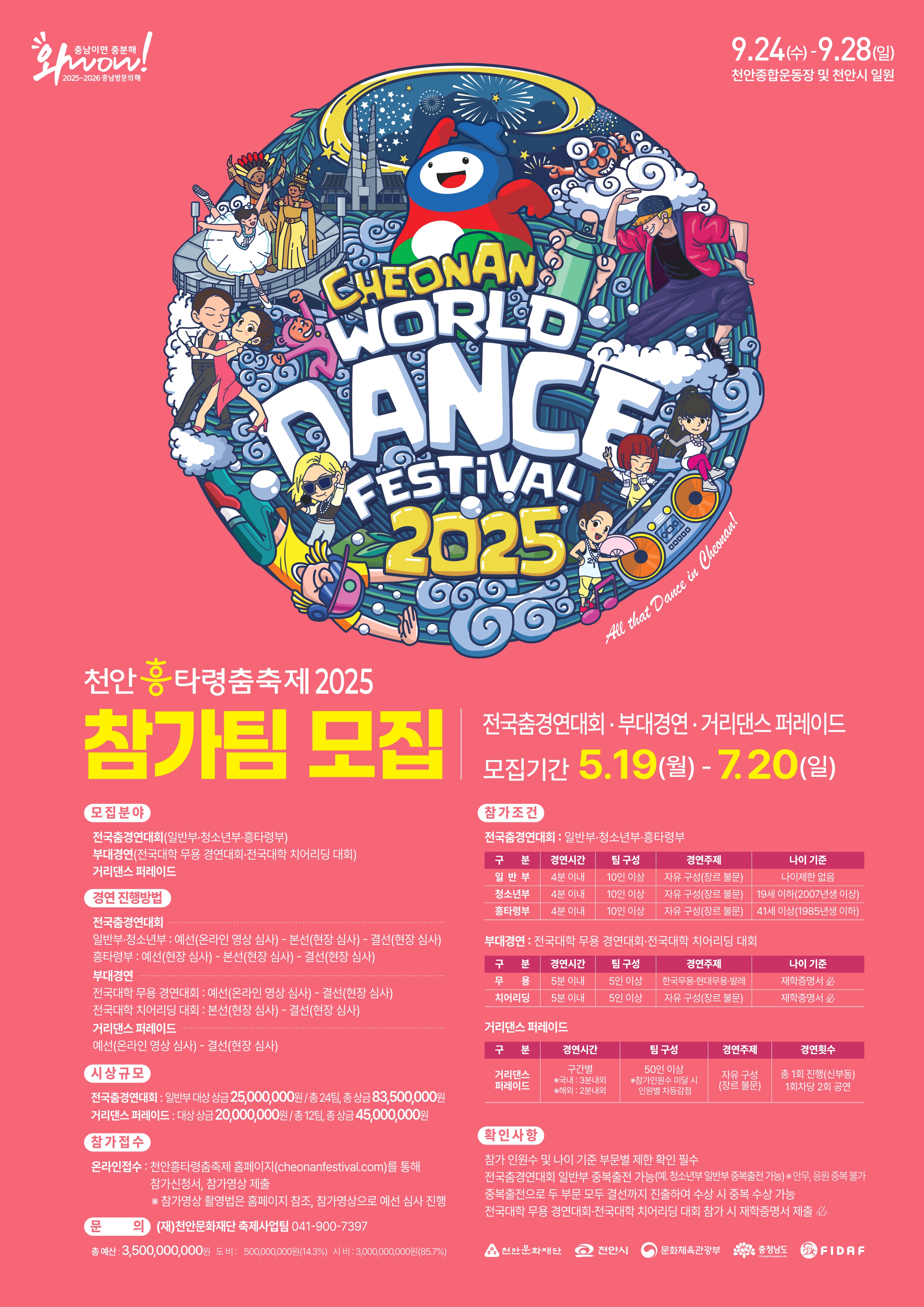 천안 흥타령춤축제 2025 춤경연 참가팀 모집 작성자한마음|작성시간25.05.08|조회수28 목록 댓글 0 글자크기 작게가 글자크기 크게가 2025_흥타령 참가자모집 포스터_pdf.pdf1.62MB 첨부파일첨부된 파일이 2개 있습니다. jpg 파일 2025_흥타령 참가자모집 포스터_jpg.jpg 다운로드 pdf 파일 2025_흥타령 참가자모집 포스터_pdf.pdf 다운로드 다음검색 현재 게시글 추가 기능 열기 북마크 공유하기 신고 센터로 신고 댓글 댓글 0 댓글쓰기 답글쓰기 댓글 리스트