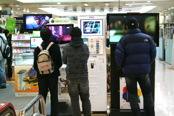 XBOX 360을 이용해 게임을 하고 있는 학생들. 국제전자센터에서는 물건만을 사는 것이 아니라, 직접 게임을 체험해 볼 수 있는 공간이 있다는 것이 큰 장점이다. 직접 해보니 확실히 컴퓨터로 하는 게임과는 느낌이 달랐다.