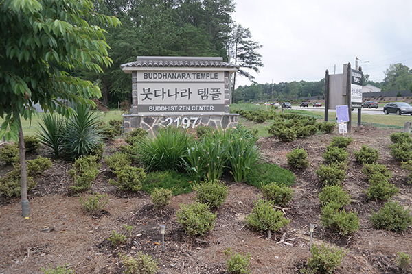 붓다나라 앞은 4차선 도로이이다. 조지아 교통국 발표로는 85번 고속도로에 Exit 117번이 사찰 앞을 통과하는 Gravel Springs Rd.로 빠지는 공사를 시작 한다고 한다. 시가 발표한 정보에 의하면 하루에 2만대의 차량이 붓다나라 앞을 지나간다고 한다. 이 차량들에게 잘 보이게 하기 위해서 간판에 저녁에는 전기불이 들어오게 만들었습니다. ‘붓다나라’ 간판은 일주문과 똑 같습니다. 일주문에 예를 들어 ‘가야산 해인사’라고 써 있듯이 ‘붓다나라’라는 간판은 같은 개념입니다. 일주문 겸 간판 즉 입구에서 처음 오신 분들을 맞이하는 얼굴이기도 하기 때문에 정성이 많이 들었습니다. 설계와 공사기간 간판 허가등 약 일 년 이상의 시간이 들었습니다. 이 간판을 보고 미국인을 비롯해서 처음 오는 사람들이 사찰을 찾아옵니다. 들어오면 법당 밖에 붓다나라 프로그램이 비치되어 있어서 누구나가 쉽게 가져 갈 수 있습니다. 안내 책자, 페이스 북, 그리고 입소문으로 법회에 참석하게 됩니다.