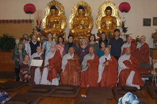 대연불보정사에서 10월 21일 미국인 사마니 수계식이 있었다. 토요일 예정보다 훨씬 늦은 시간에 시작되어서 참가자는 많지 않았지만 커네티컷주의 조그마한 도시 토링톤에는 이제 미국 백인들이 삭발하고 회색 승복에 고등색 가사를 입는 모습이 낮설지가 않다. 올해만 해도 지난 4월에 이어 2번째로 수계식을 한다. 전계사는 서경보스님의 제자인 백림사 혜성스님이고 은사는 대연불보정사 대산스님이고 증사로는 이 사찰에서 계를 받은 한국인 수연스님. 미국인 반야스님, 보각스님, 향연, 청향스님등 여러 스님이 참가하였다. 이번이 8번째이고 오늘까지 13명이 대연불보정사에서 출가를 하였다.