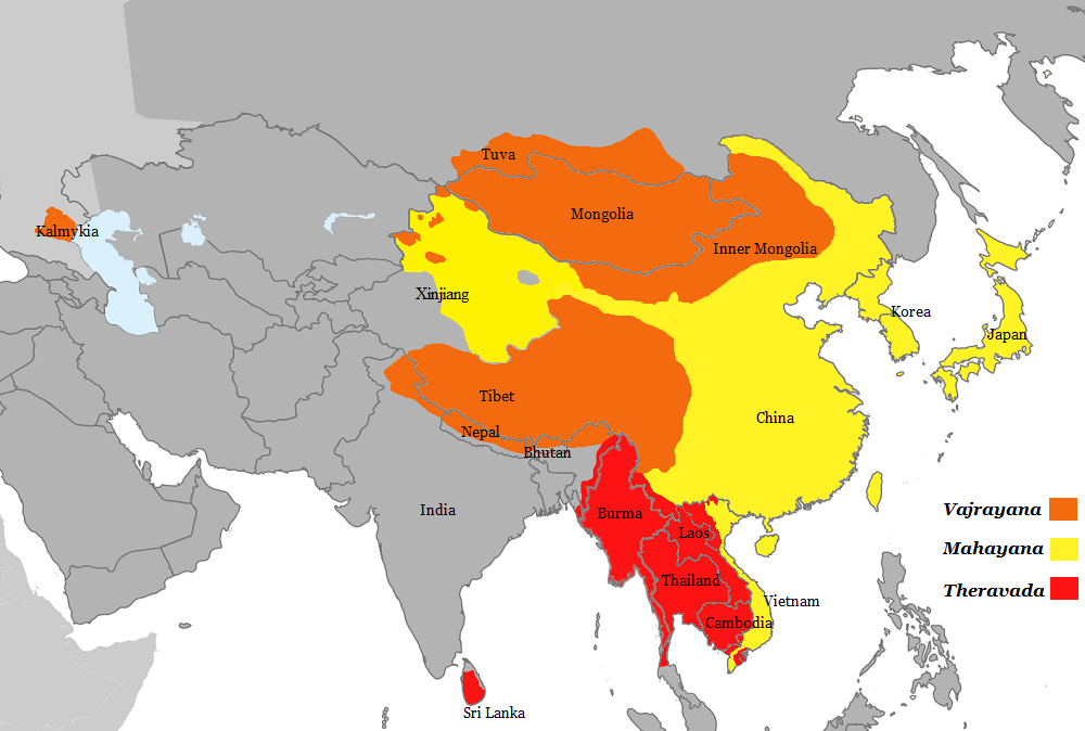 불교의 큰 세력인 마하야나, 테라와다. 금강승(바즈라야나) 불교가 다 있는 지역은 유럽, 미국과 인도 보드가야 지역이다. 이 중에서 미국은 수도 워싱턴 DC를 비롯하여 뉴욕 등 동부와 캘리포니아 등 서부, 시카고 지역의 중부등 여러 지역에 이 세 그룹이 함께 공존하고 있다. 우리는 한때 이를 대승불교, 소승불교, 라마불교라고도 표현하기도 했다. 이 말들이 현재에도 혼용되어 사용하고 있어서 혼란이 되고 있다. 테라와다를 '소승 불교'(Hīnayāna, 히나야나)라는 이름으로 부르기도 하였으나 현대에는 소승이라는 말 자체가 대승 불교가 자신과 대비되는 의미로 기존의 부파 불교를 소승이라 부른 것이라 모욕적인 의미가 담겨있다고 하여 1950년 세계불교도우의회(World Fellowship of Buddhists)에서 소승 불교 또는 히나야나라는 말은 현존하는 어느 불교 종파에 대해서도 사용되어서는 안 된다고 선언하였다. 대승 불교 측에서 임의로 붙인 표현이 바로 소승이다. 자기들은 수많은 중생을 구제하니 큰 수레(대승)고, 저쪽은 개인의 해탈만을 중시하니 작은 수레(소승)이라는 것이다. 한국에서도 탄허 스님은 당시에 사용하던 대승, 소승 이런 구분을 옳지 않다고 지적하고, 불교는 일승(一乘)이라고 주장했다고 한다.