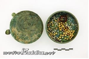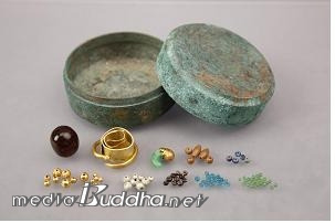 | 미륵사지 서탑에서 발견된 청동합의 유리구슬과 보석류. |