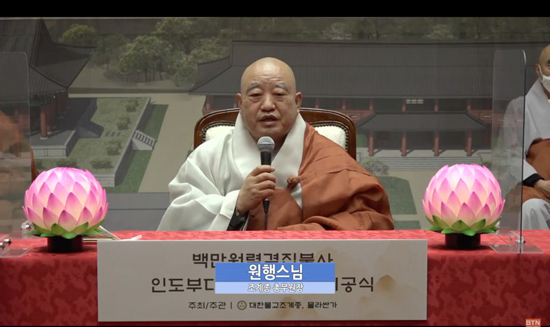 인도 현지에서 축사에 이어 한국불교역사문화기념관에서 총무원장 원행큰스님의 치사가 있었다.
