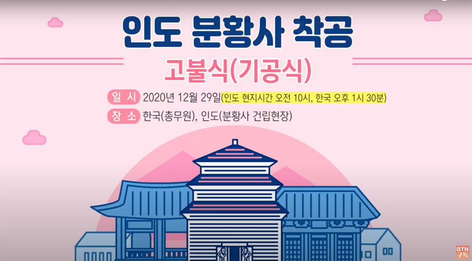 조계종 원행 현 총무원장 스님의 취임 후 역점사업으로 ‘백만 원력 결집불사’를 추진중인데한국국내에서 추진된 세종 광제사와 계룡대 홍제사 불사 등이 있고, 해외불사로는 미국이나, 유럽이 아니고 인도로 결정했다. 그래서 추진하는 해외불사가 인도 붓다가야에서 토대를 구축하고 인도불교 복원을 위한 300년 불사를 하는 붓다팔라 스님이 이끄는 물라상가(Mula Sangha)와 협업 계약을 하고 추진하는 한국전통사찰 분황사 건립이다. 분황사 건립 기공식은 원래 2020년 3월 원행 총무원장 스님을 비롯한 조계종단 임원진과 본사 주지 등 많은 사람들이 참가한 가운데 할 예정이었으나 COVID19 때문에 연기되어 작년 12월29일 오후1시30분(인도 현지시각 오전10시) 한국불교역사문화기념관 4층로비에서 BTN불교 TV가 한국과 인도를 화상으로 연결해 유튜부로 생중계하면서 진행되었다.