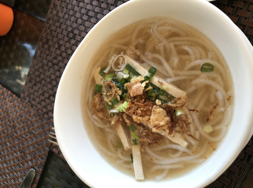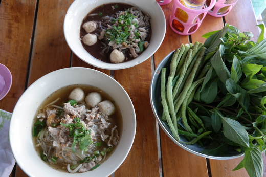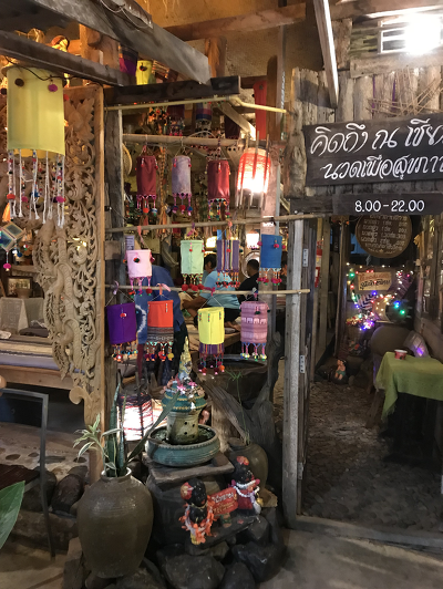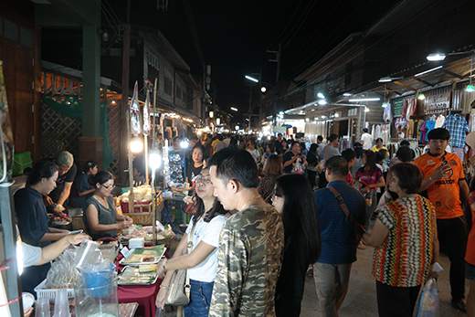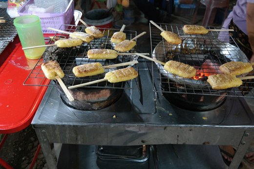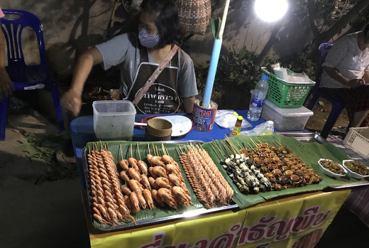 네 번째는 이곳에는 이지역 토산 식품인 로컬 푸드가 있다고 한다. 찰쌉과 달걀로 만들어 나무에 꽂아 만든 ‘찰쌀밥음식(카우치)’ , ‘카우삐약센’이라 불리는 쌀국수, 새우요리 등. 몇 가지는 이곳의 토산품이라고 한다. 태국은 바나나와 코코넛, 열대성 과일들의 매우 풍부한 곳이다. 이곳에서 처음으로 바나나 구운 것을 길거리 노점상에서 먹었는데 맛이 매우 좋았다. 나는 이곳에서 몇 번 카우치를 비롯한 찹쌀 음식을 먹었는데 이상하게 저녁에 배가 아팠다. 찹쌀만의 음식은 위장 상태가 좋지 않은 사람에게는 위가 아프다고 전에 알던 것을 다시 기억하게 되었다. 이곳 뿐만 아니라 태국 여행할 때 좋은 점은 이런 음식들의 가격이 1달러 내지 2달러뿐이라는 사실이다. 고급스런 음식점에 가도 10달러면 가능하다. 음식 맛의 절반은 분위기라고 하는 말이 있는데 길거리이던지, 음식점이던지 여행객의 느끼는 기분이 좋아서인지 나는 이곳에서 5일간 머무는 동안 과일과 코코넛 그리고 쌀 국수를 비롯한 여러 가지를 매우 맛있게 실컷 먹었다.