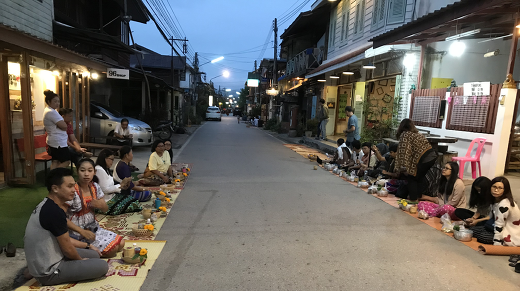 차이콩 거리에서 아침에 탁발오는 스님을 기다리는여행자들