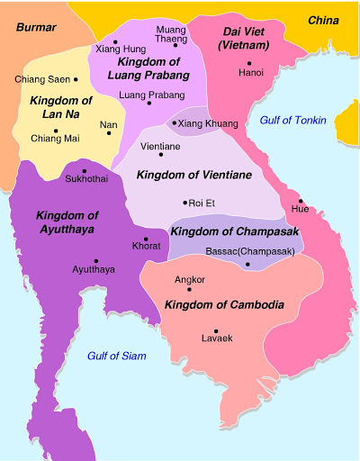 위에 설명한 미얀마와 타이의 흥망성쇠에 따라 북쪽에 위치한 비엔티엔 왕국과 루앙프라방 왕국은 1763년에서 1769년 사이 미얀만의 속국이 되었다가 1779년 시암(태국) 왕국에 의해 속국이 되는 운명을 맞게 된다. 반면 이 시기 라오스 남부에 위치한 상대적으로 인구가 적었던 참파삭 왕국은 타이와 캄보디아와 국경을 나누고 있었으나 캄보디아가 16세기에 쇠퇴하여 타이의 속국화 되어 타이의 영향권 안에 머물게 된다.