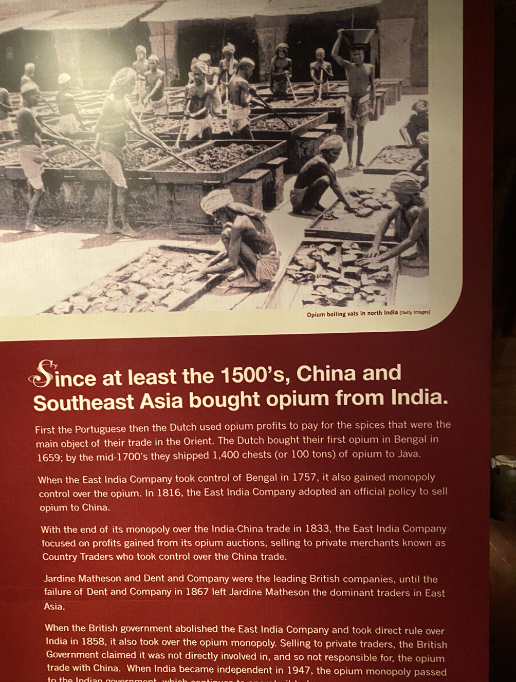 아편의 세계사, 아편의 전쟁사와 그로 인한 폐해, 그리고 아편에 의해 죽어가는 비참한 인간의 모습 등이 각 세션 별로 잘 정리되어 사진으로, 영상으로 보여주고 있다. 아편을 싣고 장사하던 배, 영국과 중국의 아편 전쟁에 대해 아주 자세하게 사진과 설명. 그리고 영상이 있다.