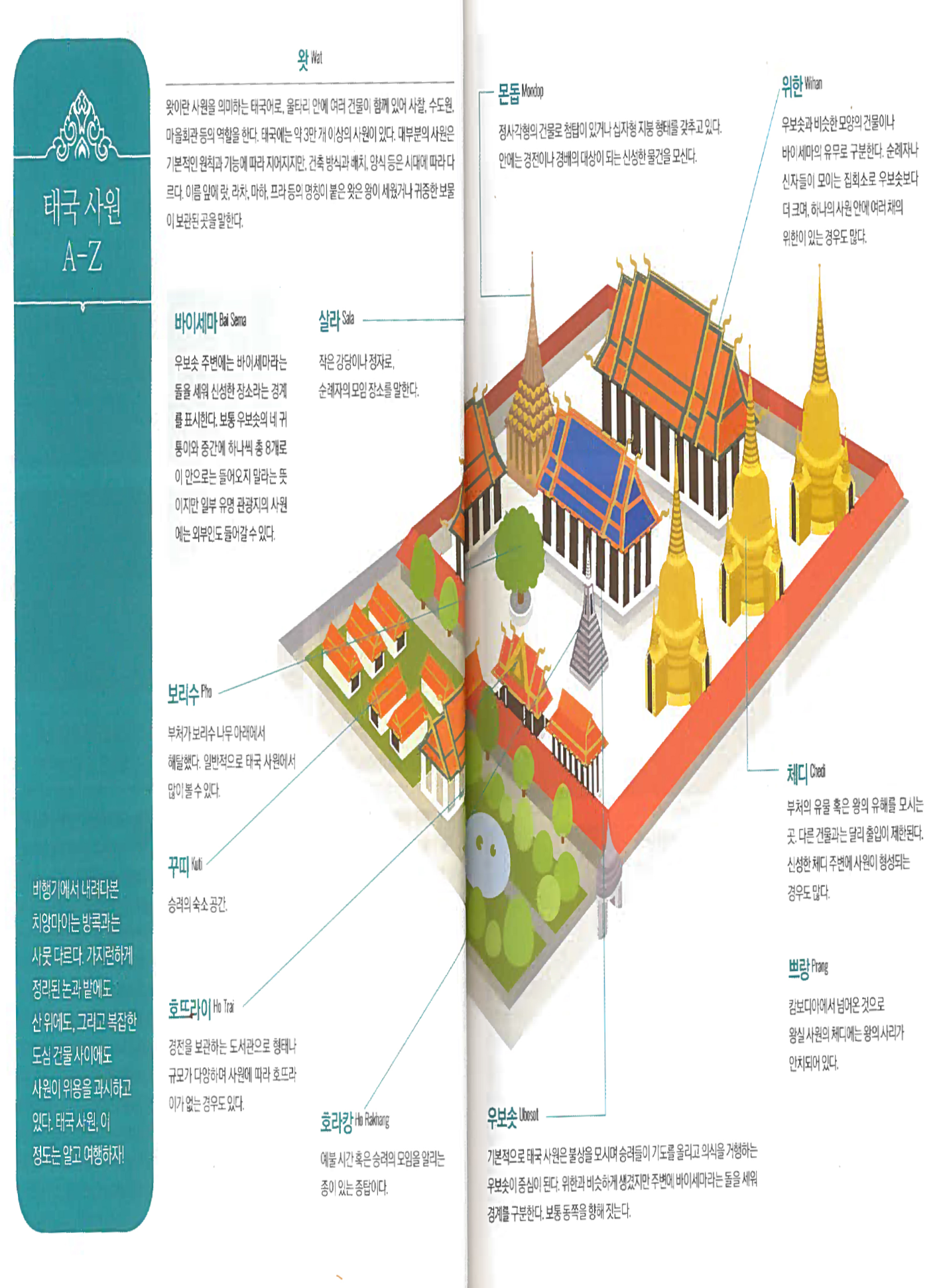 태국 사찰은 대개 우보솟, 위한, 살라, 불탑, 그리고 경전을 보관하는 장경각인 호 뜨라이와 종각 등이다.