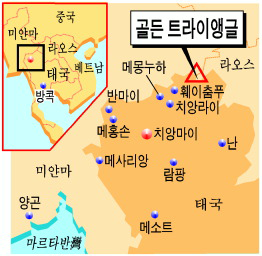 이 지역은 아편 생산에 최적의 기후와 자연조건을 갖춘 천혜의 요지로 알려진 곳으로 19세기부터 양귀비가 재배되었고 세계 제일의 마약 제조 창구의 역할을 담당하면서 세계 마약 전체 유통량의 80%를 공급해왔다(미국에 유통되는 헤로인의 60% 차지). 1980년대 초에 마약왕이자 샨족(미얀마의 주류 민족) 독립운동을 지휘했던 쿤사(Khun Sa)가 소수민족에 양귀비 생산을 강요하면서 세계 최대의 아편 생산지가 되었으며, 아편 거래가 금으로 이루어져 ‘골든 트라이앵글’이라는 명칭을 얻게 되었다.