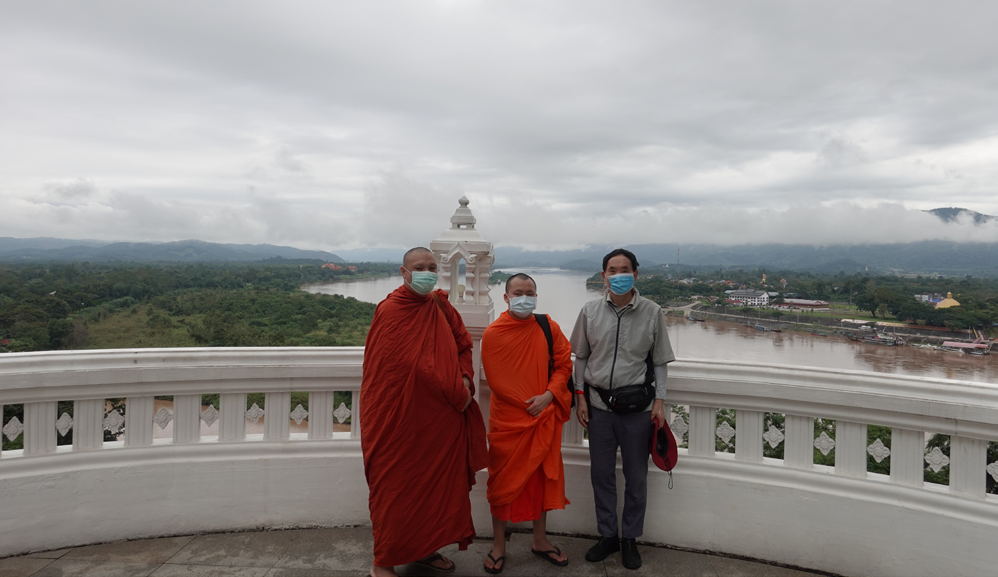 오늘은 골든 트라이앵글-황금의 삼각지대를 관광하였다. 이 지역의 이름은 매싸이(Mae Sai)이라고 한다. 도로를 사이에 두고 산과 메콩강이 있다. 차를 타고 산위에 있는 사찰 '왓 프라타우 푸 카우 Wat PhraThat PuKhao'까지 올라갔다. 조금 올라가니 큰 건물이 나오고, 조금 더 올라가니 전망대가 나왔다. 전망대 한쪽에는 그림으로 된 지도에는 태국, 미얀마, 라오스, 그리고 미얀마 더 위쪽의 중국 운남성 까지 자세하게 소개하고 있다. 그래서 세 개 나라가 아니라 네 개의 나라가 만나는 지역이라고도 한다고 한다. 그리고 이 지역의 사찰들도 표시해 놓고 있다. 전망대에서는 세 나라가 훤히 보이는데 사찰 밑의 도로에 있는 전망대보다는 이 곳의 전망대가 더 멀리 입체적으로 잘 보였다. 아마 코로가 시기가 아니었다면 이곳은 많은 관광객들로 붐비었을 것이다. 내가 방문하던 시간에 태국의 다른 지역에서 관광 온 많은 스님들이 들어왔다.