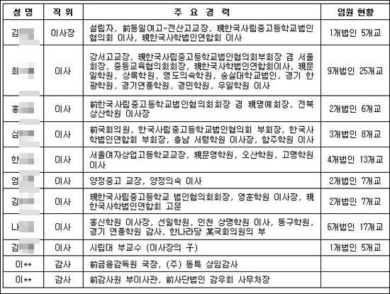 우선 최순영·이경숙 의원 등이 서울시 교육청에서 제출받은 동일학원 이사진들 관련 자료를 살펴보면, 9명의 이사진 대부분이 한국사학법인연합회 전·현직 간부들이다.