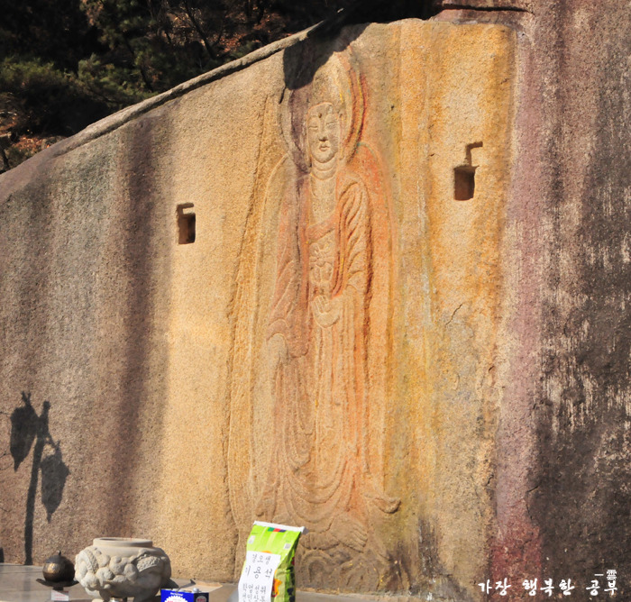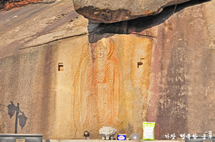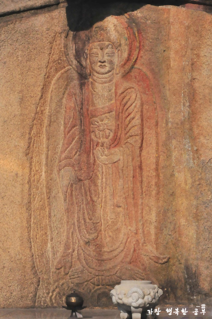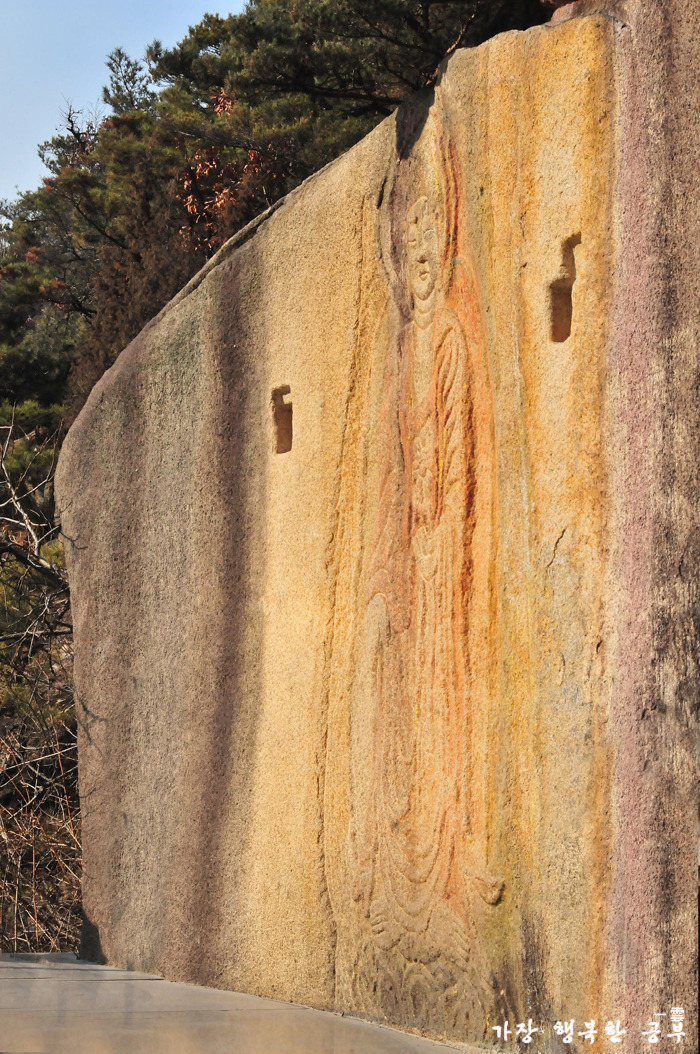 계곡 벼랑 큼직한 바위에 새겨진 마애불은 여래로 보이는 입상이다.