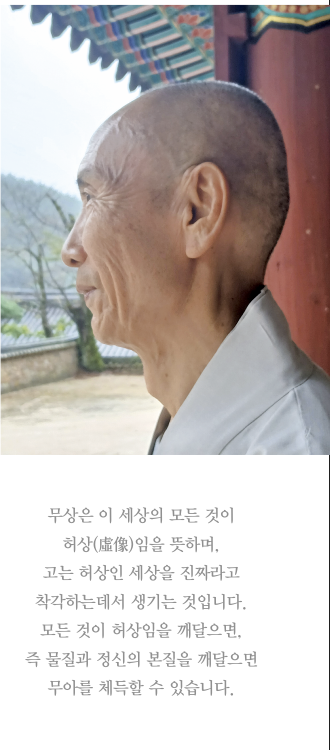 스 님 무상은 이 세상의 모든 것이 허상(虛像)임을 뜻하며, 고는 허상인 세상을 진짜라고 착각하는데서 생기는 것입니다. 모든 것이 허상임을 깨달으면, 즉 물질과 정신의 본질을 깨달으면 무아를 체득할 수 있습니다.