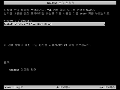 이제 시스템을 재부팅해보면 아래와 같이 Install Windows 7 [From Hard Disk] 부팅 항목이 추가되어 있을 겁니다. 해당 메뉴로 부팅을 진행하면 윈도우 7 설치 DVD 나 USB 메모리로 부팅했을 때와 같이 윈도우 7 의 설치를 바로 시작할 수 있습니다. 간단하죠?