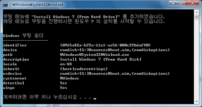 그런데 재부팅하였는데 'Install Windows 7 [From Hard Disk]' 항목이 뜨지 않고 XP로 부팅되더군요..